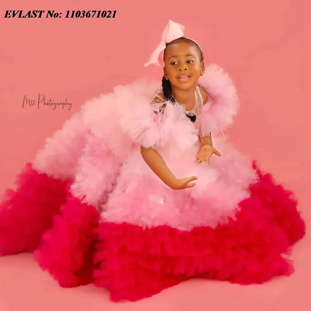 EVLAST Customized Pink and Red Flower Girls Dress for Weddings Ruffles Tiered Girls Pageant Gown First Communion Dress FD72