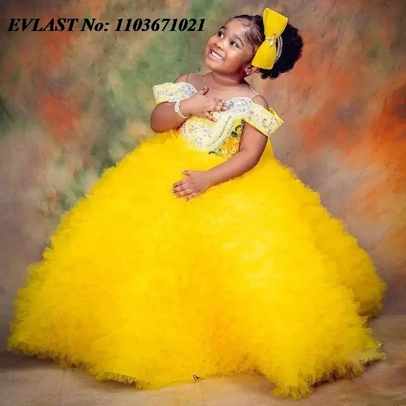 EVLAST Customized Yellow Gold Flower Girl Dress for Weddings Crystal Beaded Ball Gown Kids Ruffles Birthday Party Gowns FD17