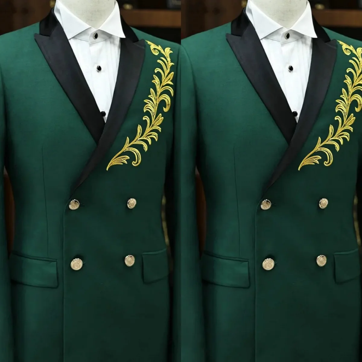 Exquisite Green Wedding Tuxedos 2 Piece Set Jacket Pants Double Breasted Men Suit Appliques Groom Wear Party Suits Customized