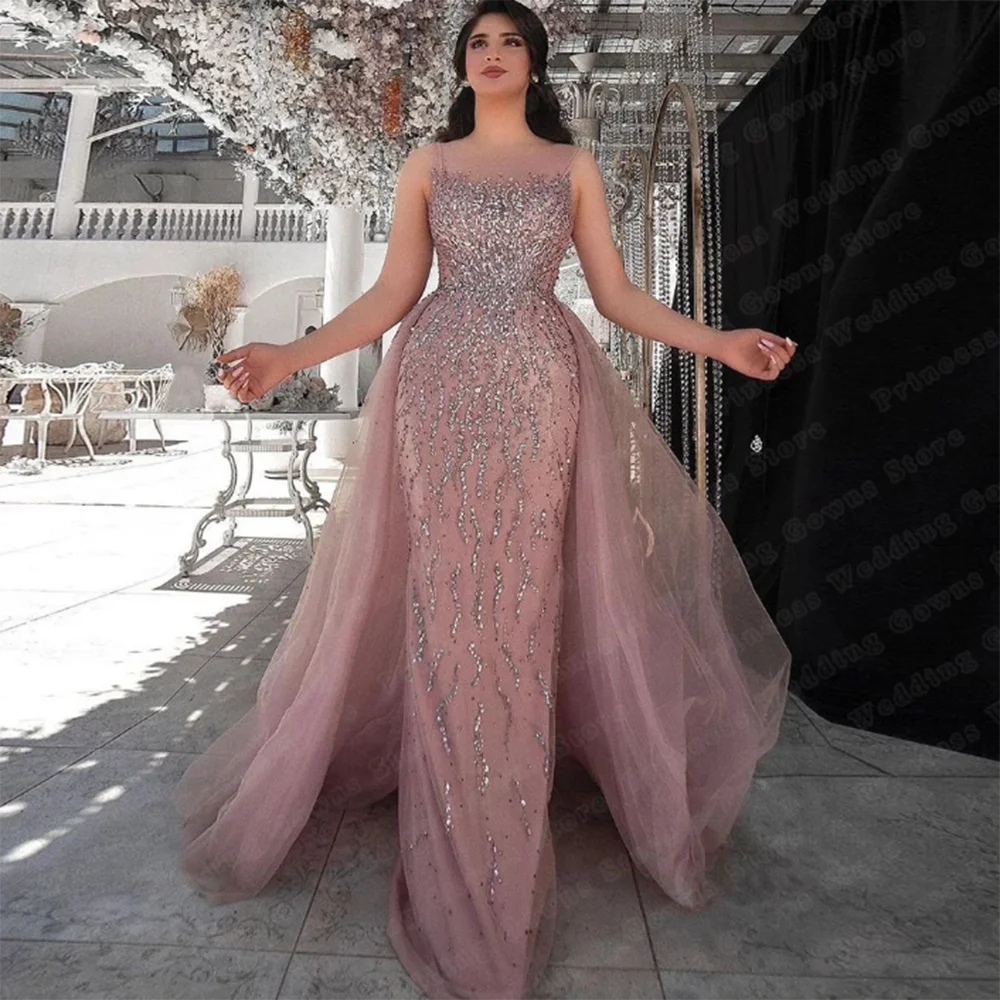 Exquisite Pink Formal Evening Party Dresses O-Neck Floor Length A-Line Shiny Spaghetti Strap Elegant Fashion Women Prom Gowns