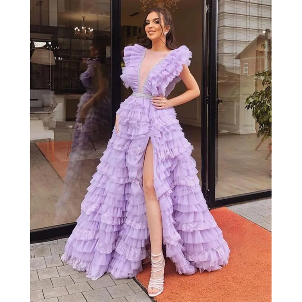 Exquisite Purple Women Prom Dresses V-Neck Spaghetti Strap Floor Length A-Line High Side Split Sexy Fashion Evening Party Gowns