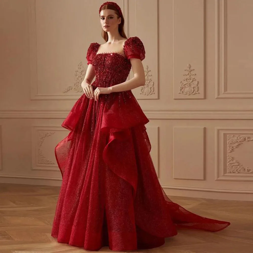 Item: Exquisite Red Women Prom Dresses Square Collar Short Sleeves A-Line Floor Length High Quality Shiny Luxury Evening Party Gowns