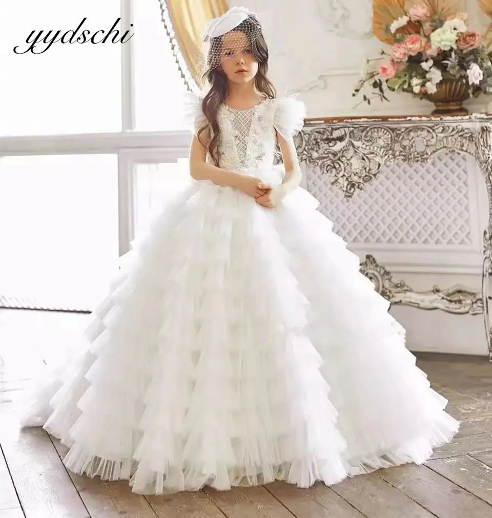 Exquisite White Ball Gown Puffy Flower Girls Dress For Wedding 2025 Princess Tulle Ruffle Tiered Appliques First Communion Gowns