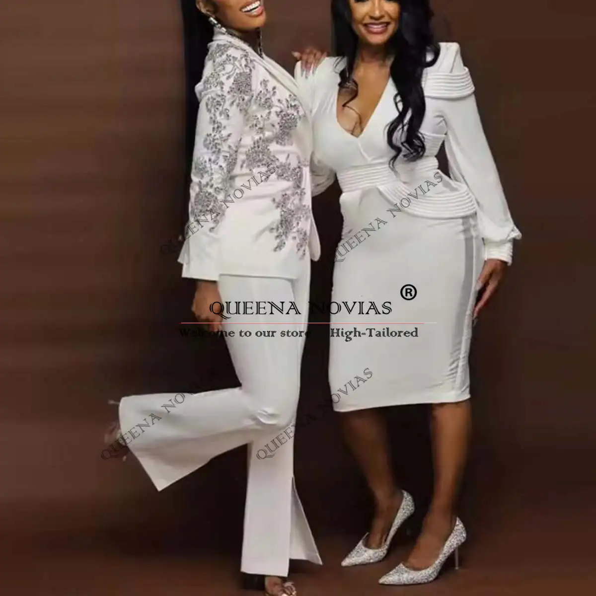 Exquisite Women Suits 2 Piece Beads Diamond Jacket Pants Outfit Lady Office Female Peaked Lapel Blazer Mother Of Bride Dresses