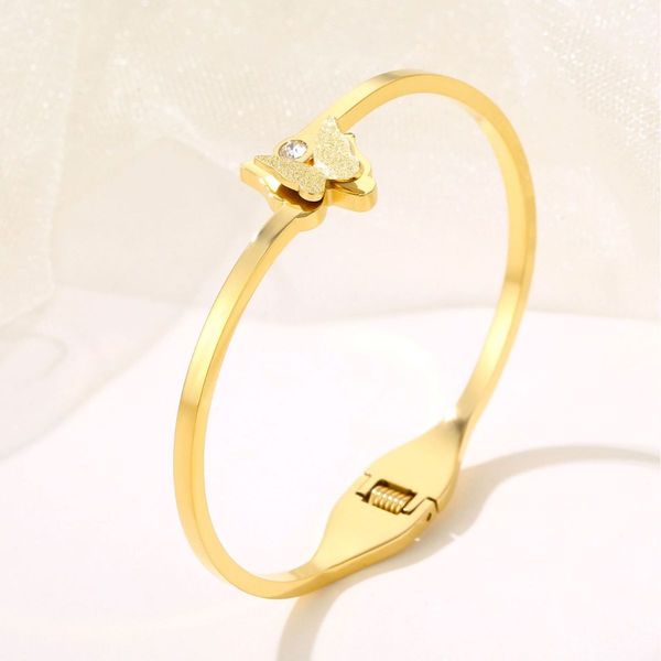 Fashion Gold-Plated Butterfly Open Bangle with Zircon, Non-Fading Stainless Steel, Matte Finish, Perfect Women's Bracelet Wholesale