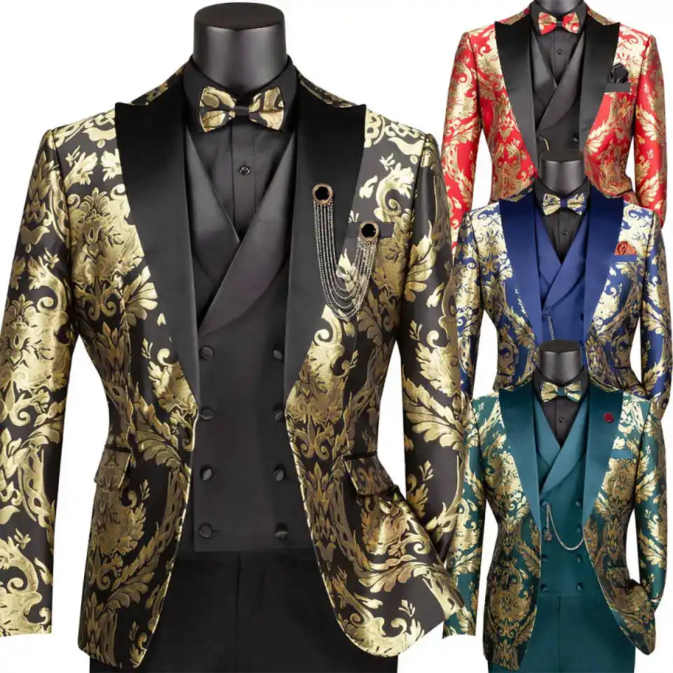 Fashion Wedding Tuxedos Jacquard Peaked Lapel Men Suits 3 Piece Set Jacket Vest Pants Business Formal Blazers Customized
