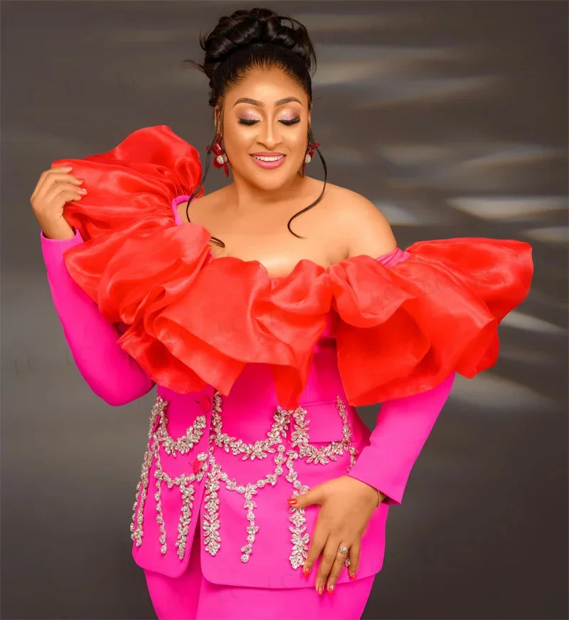 Fashion Women Suits 2 Piece Blazer Pants One Button Beads Appliques Off Shoulder Waistless Party Slim Fit Plus Size Tailored