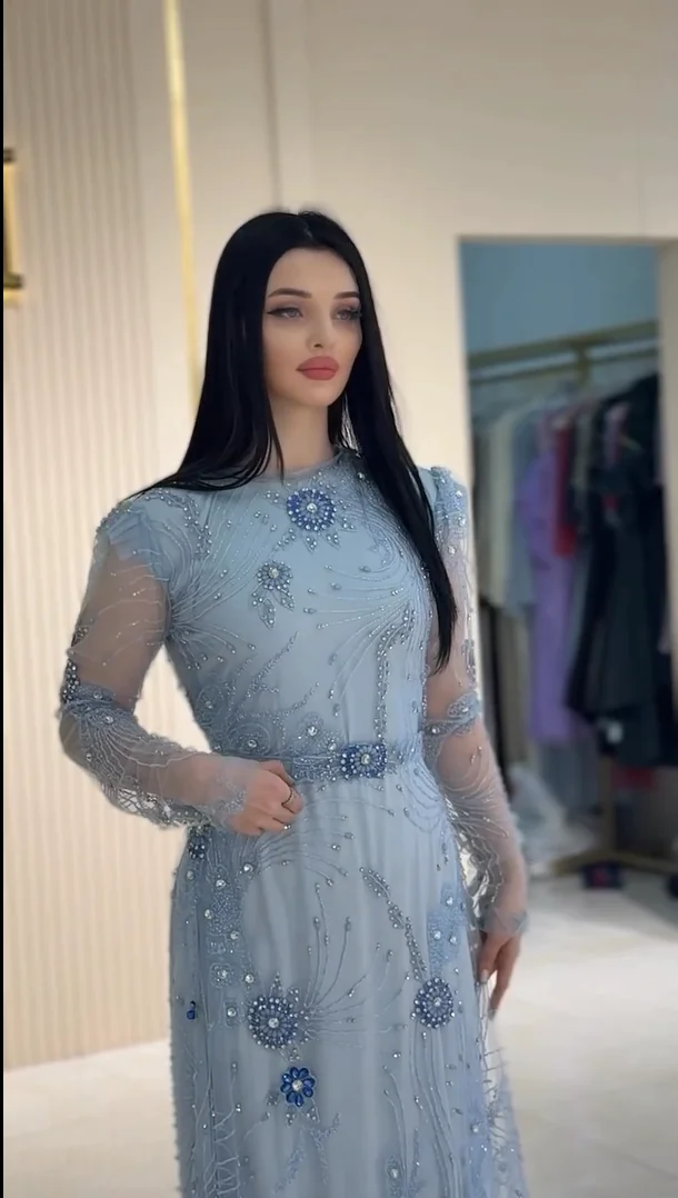 FATAPAESE Customized Fully Crystal Bead fish-scale shaped Dangling Beads Gown Long Sleeve Floor-length Formal Party Maxi Dress