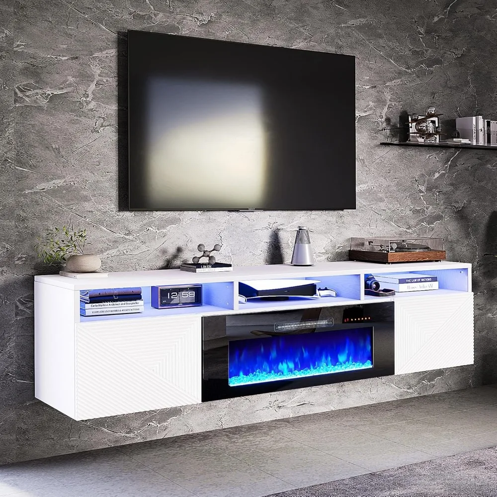 Item: Floating TV Stand with 36″ Electric Fireplace, 70in Wall Mounted Entertainment Center with High Gloss Geometric Doors, Media Co