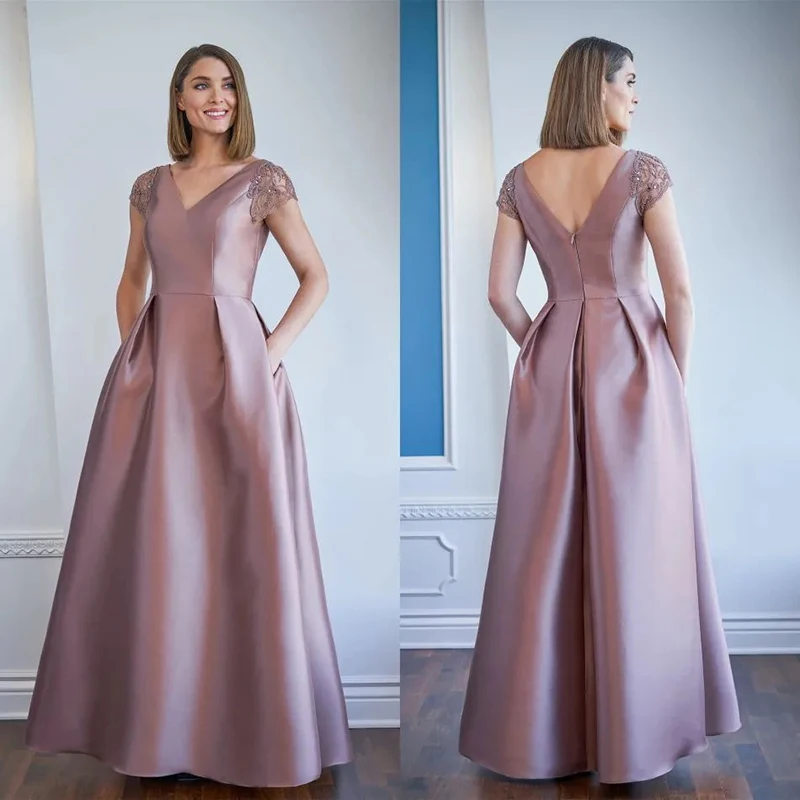 Floor Length A Line V Neck Capped Sleeve Lace Beading Satin Mother of the Bride Dresses For Weddings فساتين السهرة Customized