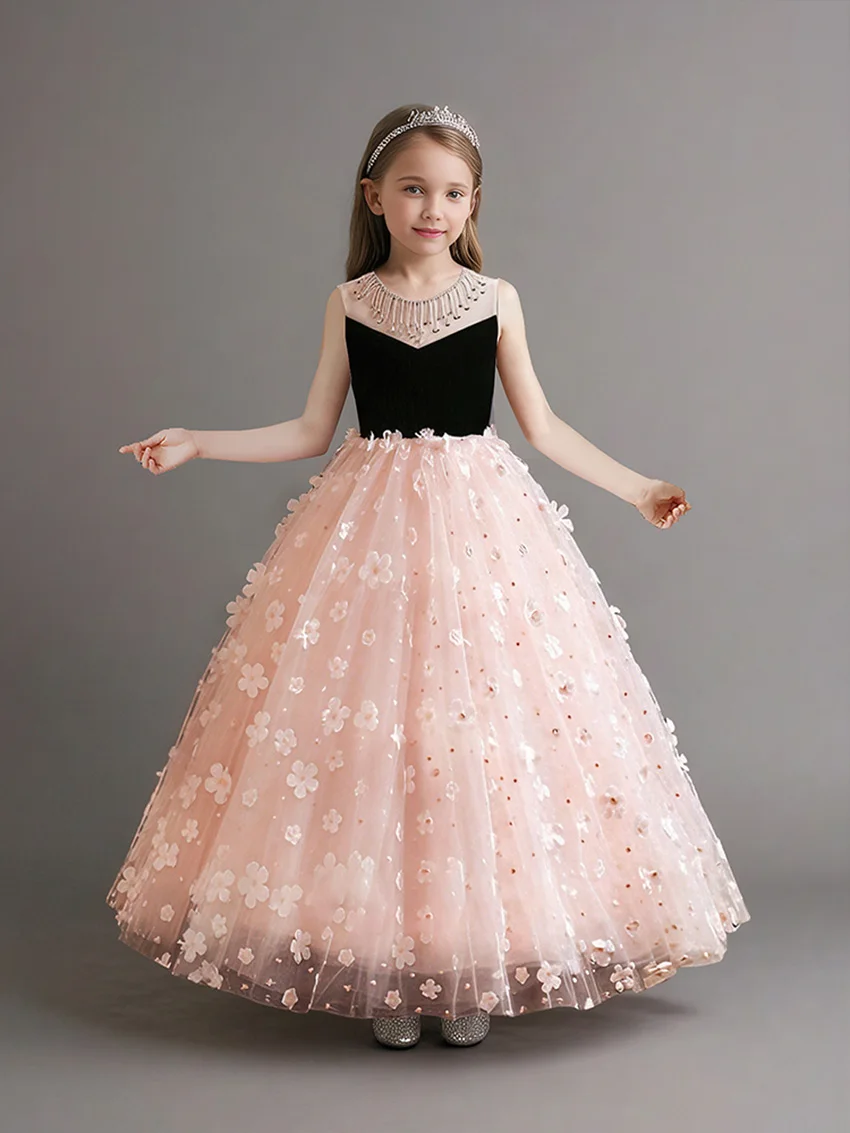 Girls Sleeveless Neckline Tassel Skirt Three-Dimensional Flower Wedding Dress Junior Bridesmaid Dress Prom Party/Custom