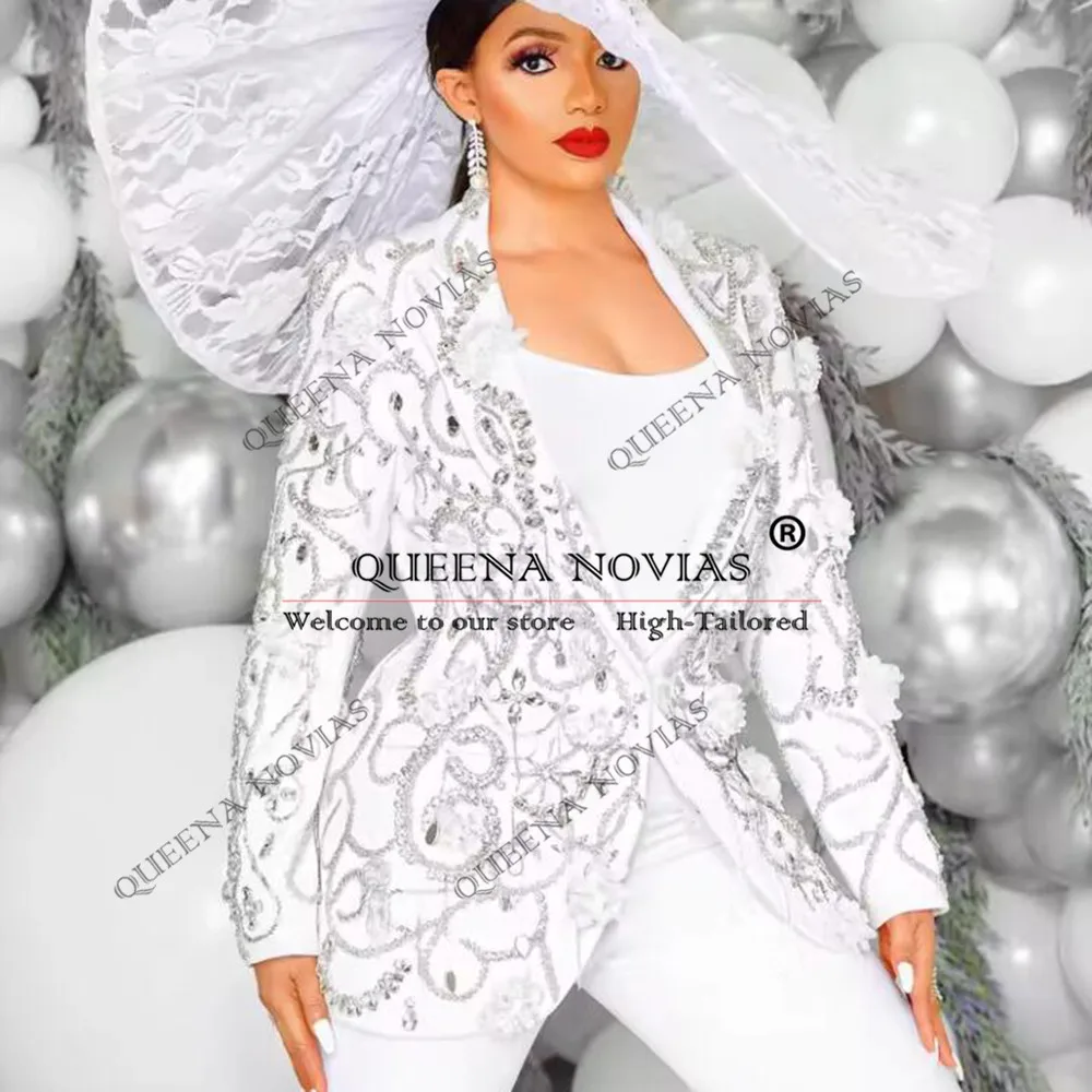 Glitter Crystal Beaded Women Pants Suits Customized 2 Pieces African Black Grils Wide Trousels Casual Party Dress Laides Tuxedos