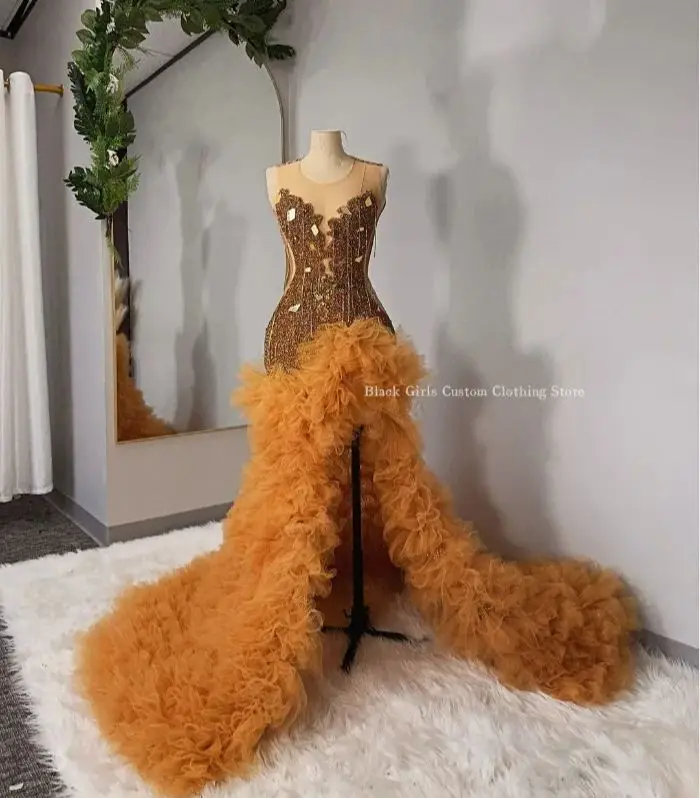 Item: Gorgeous Ginger Mermaid Evening Gowns Elegant Crystal Beaded Applique Sexy High Split Lace Black Girls Customised vestidos