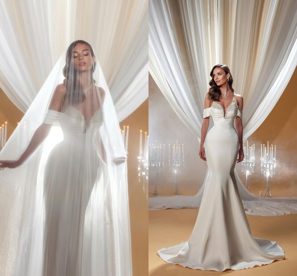 Gorgeous Plus Size Mermaid Wedding Dresses for Bride Women Off Shoulder Beaded Pearls Backless Satin Sweep Train Bridal Gowns Vestidos De Noiva