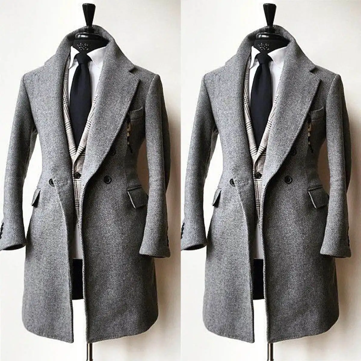 Gray Cotton Mens Overcoat Tweed Wool Winter Warm Groom Coat Outdoor Wear Long Jacket One Piece