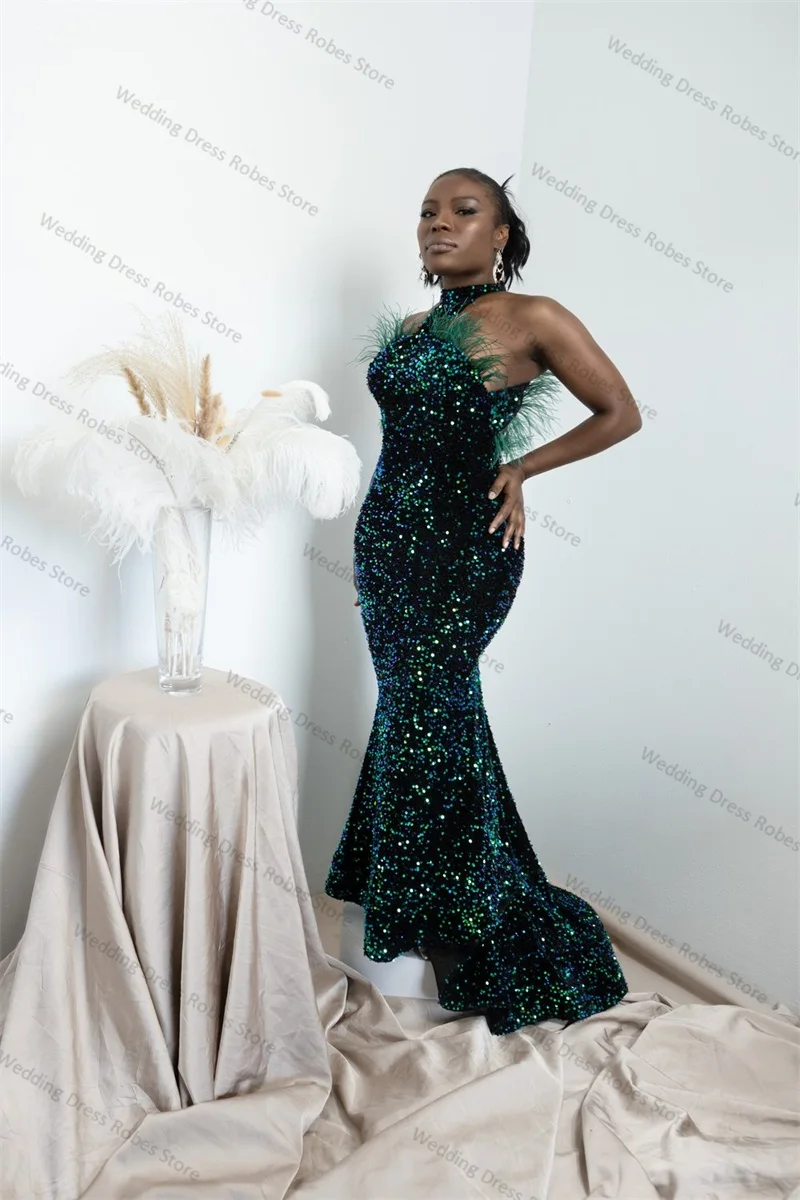 Green Sequins Women Prom Dress Sexy Sleeveless Mermaid Bridal Party Gown Sweep Train Evening Gown Sleepwear Customized Skirt