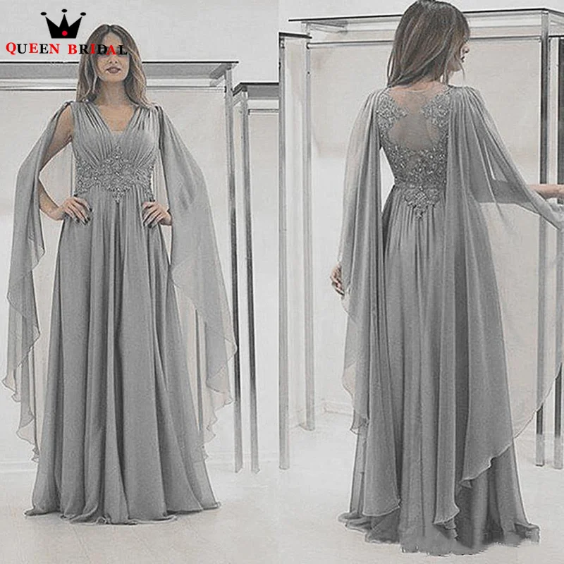 Grey Chiffon Mother of the Bride Dress with Cape Silver Appliqued Lace Formal vestido madre del novio boda 2023 Custom Made DT46