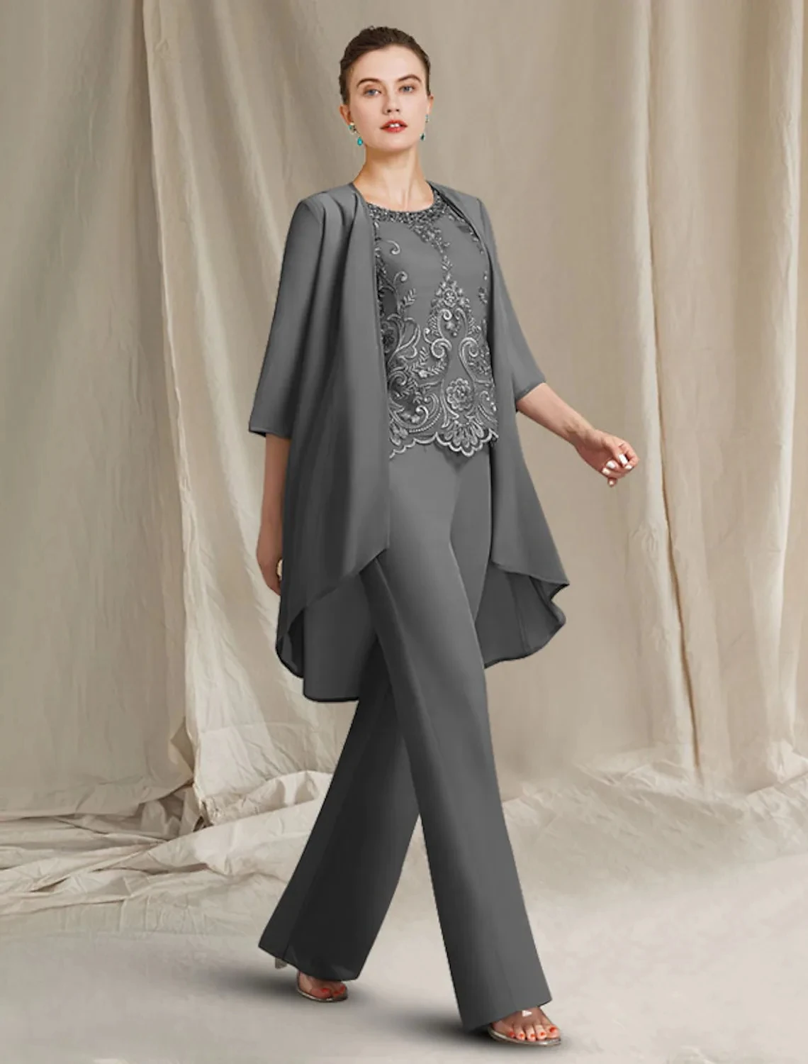 Description: Introducing the Grey Pantsuit 3 Piece Suit – Mother of the Bride Dress, Jewel Beading Lace Chiiffon Wedding Party Gowns Robe de Soiree! Inspired by classic French gowns, this grey suits features a beautifully embroidered beaded lace on the chest and shoulders. The jacket is made of an ivory blend that pairs perfectly with our signature matte black and silver metallic panels. This versatile piece boasts a fitted midi skirt that flows effortlessly down your legs, making it the perfect fit for any occasion. The panels on the collar of this suit add a touch of elegance to the classic wedding day look. You will feel like royalty in this gorgeous grey suits. The unique design allows you to easily transition from formal events to casual occasions, making it an excellent choice for any upcoming wedding, special occasion or festive event. Don’t miss out on this captivating Grey Pantsuit 3 Piece Suit – Mother of the Bride Dress, Jewel Beading Lace Chiiffon Wedding Party Gowns Robe de Soiree. Order now and experience the ultimate comfort, beauty, and style that only a well-designed wedding attire can offer! [Sale text] Limited time offer – use code [INSERT CODE HERE] at checkout for an additional 10% discount! Hurry while stock lasts!