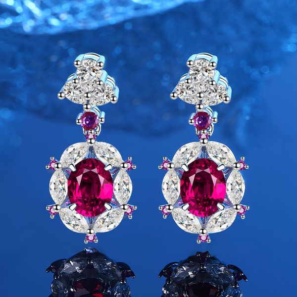 Hot Sale S925 Sterling Silver Simulated Pigeon Blood Ruby 7x9mm Stud Earrings, Long Drop Earrings for Women, Elegant Luxury Jewelry