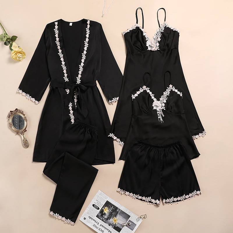 Ice silk pajamas women’s summer five-piece long-sleeved suspender nightdress thin section sexy lace with chest pad home clothes