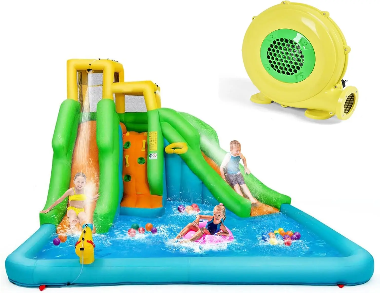 Inflatable Water Slide, 6 in 1 Water Park Waterslide Inflatables with Climbing Wall, 480W Blower, 2 Long Slides, Splash Pool