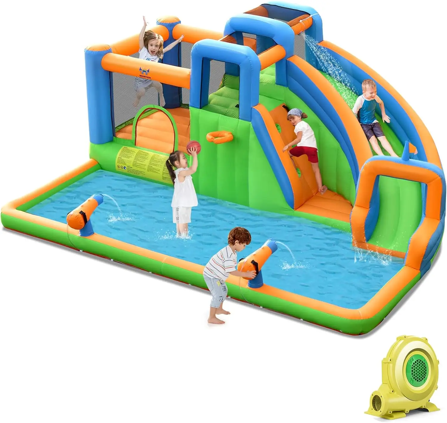 Inflatable Water Slide, 7 in 1 Giant Water Park Bounce House for Outdoor Backyard with 735W Blower, Splash Pool & Cannons, Climb