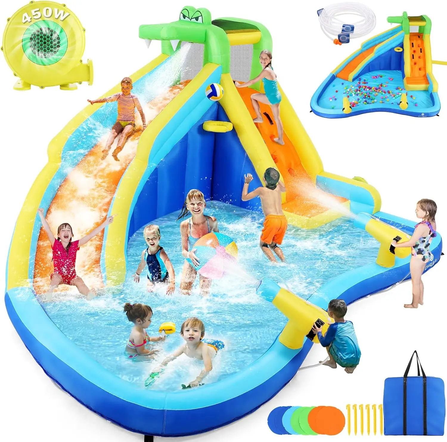 Inflatable Water Slide Bounce House 8-in-1 Large Water Park with 450W Blower/Splash Pool/Climbing Wall/Crocodile Water Spraying