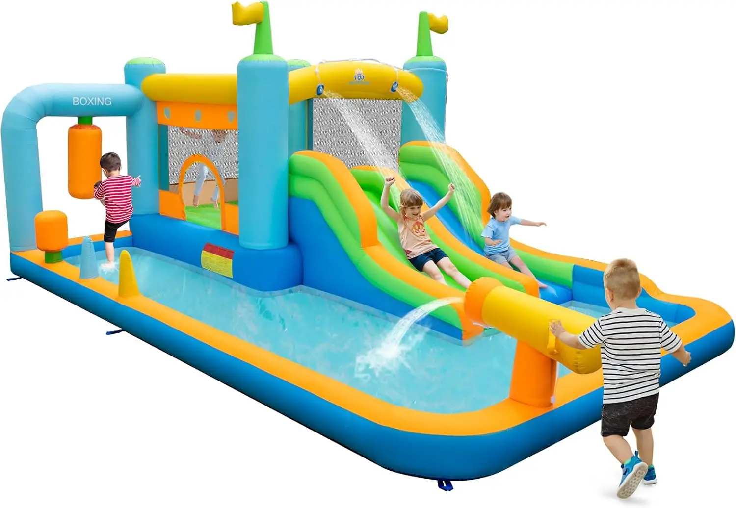 Inflatable Water Slide, Boxing Themed Water Bounce House with Double Waterslides for Kids Backyard, Blow up Jump Castle Water Sl