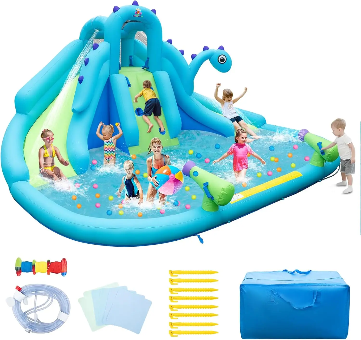 Inflatable Water Slide, Dinosaur Water Bounce House Park for Kids and Adults Outdoor, Dual Slides & Splash Pool, Wet Dry Combo B