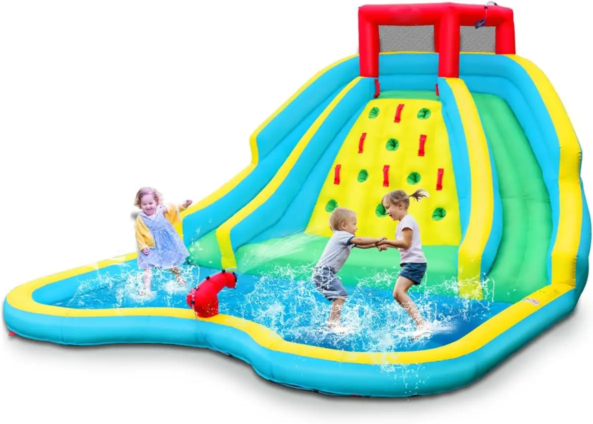 Inflatable Water Slide, Water Park Bouncy House w/Splashing Pool, 2 Slides, Climbing Wall & Water Cannon, Blow Up Waterslide for