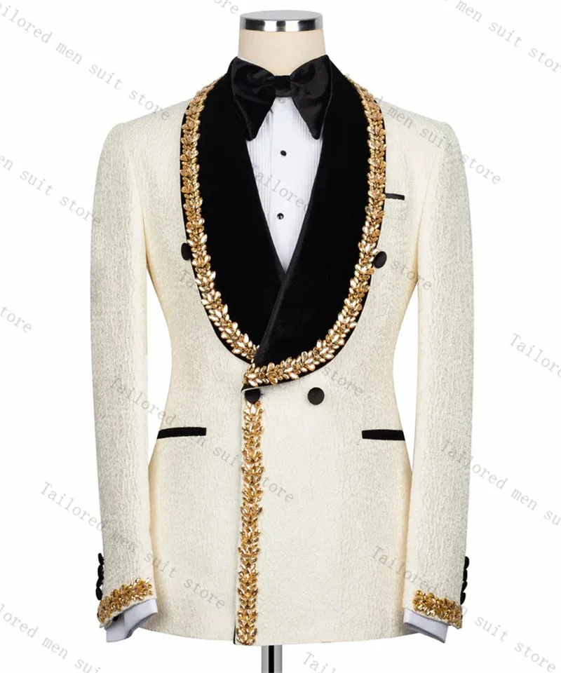 Jacquard Men Suits Pants Set 2 Pcs Crystals White Blazer+Black Trousers Velvet Lapel Wedding Tuxedos Prom Jacket Formal Coat