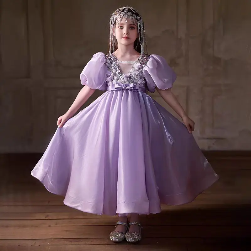 Jill Wish Elegant Lilac Flower Girl Dresses Luxury Beading Puff Sleeve Kids Wedding Birthday Party Pageant Evening Gown J028