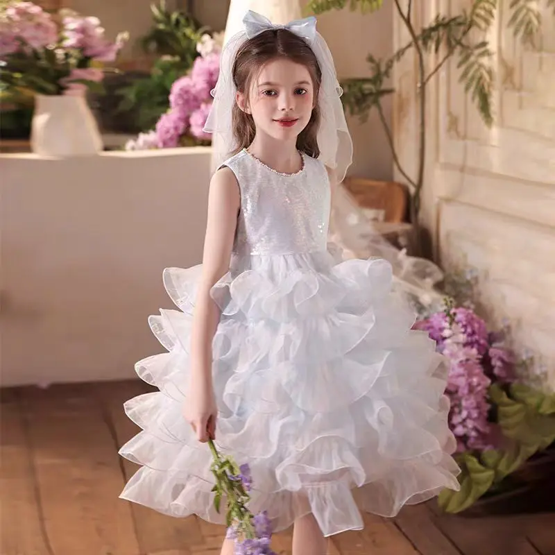 Jill Wish Elegant Shiny White Flower Girl Dress Tiered Puffy Princess Children Wedding 1st Birthday Pageant Party Ball Gown J430