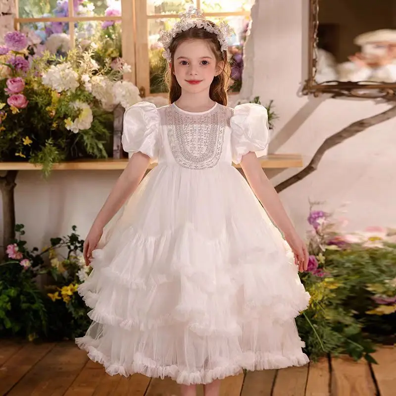 Jill Wish Elegant White Flower Girl Dress Lace Puffy Princess Kids Tea Length Wedding 1st Birthday Pageant Party Ball Gown J004