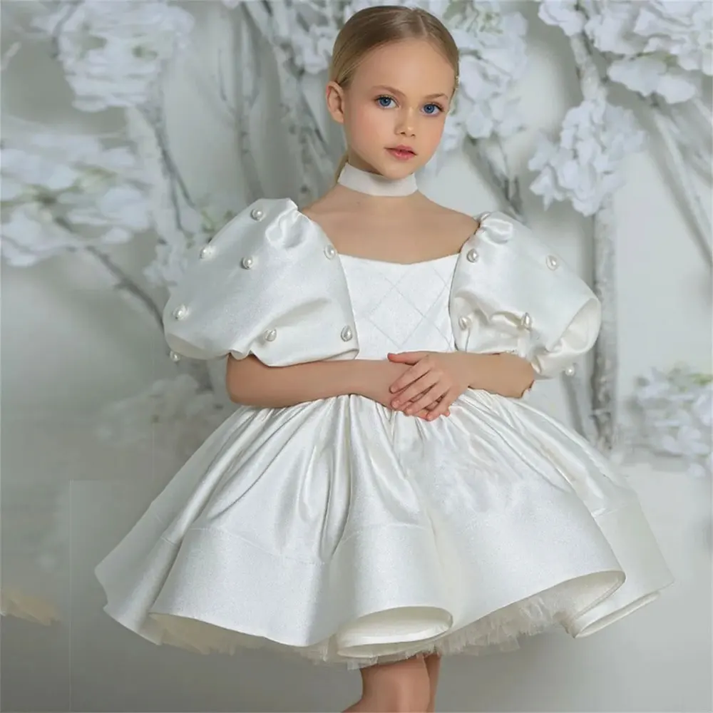 Jill Wish Elegant White Flower Girl Dress Pearls Princess Baby Kids Wedding Birthday First Communion Party Prom Gown 2025 J305
