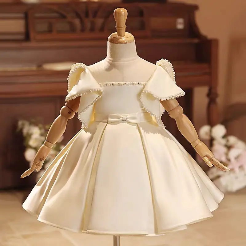 Jill Wish Elegant White Satin Girl Dress Knee Length Puffy Sleeve Children Princess Wedding Toddler Birthday Party Gowns J497