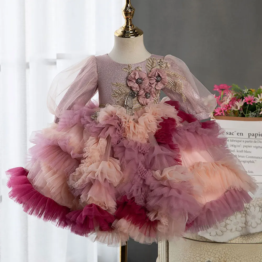 Jill Wish Floral Dubai Fuchsia Flower Girl Dresses Arabic Appliques Princess Kids Gown for Baby Birthday Wedding Party Show J402
