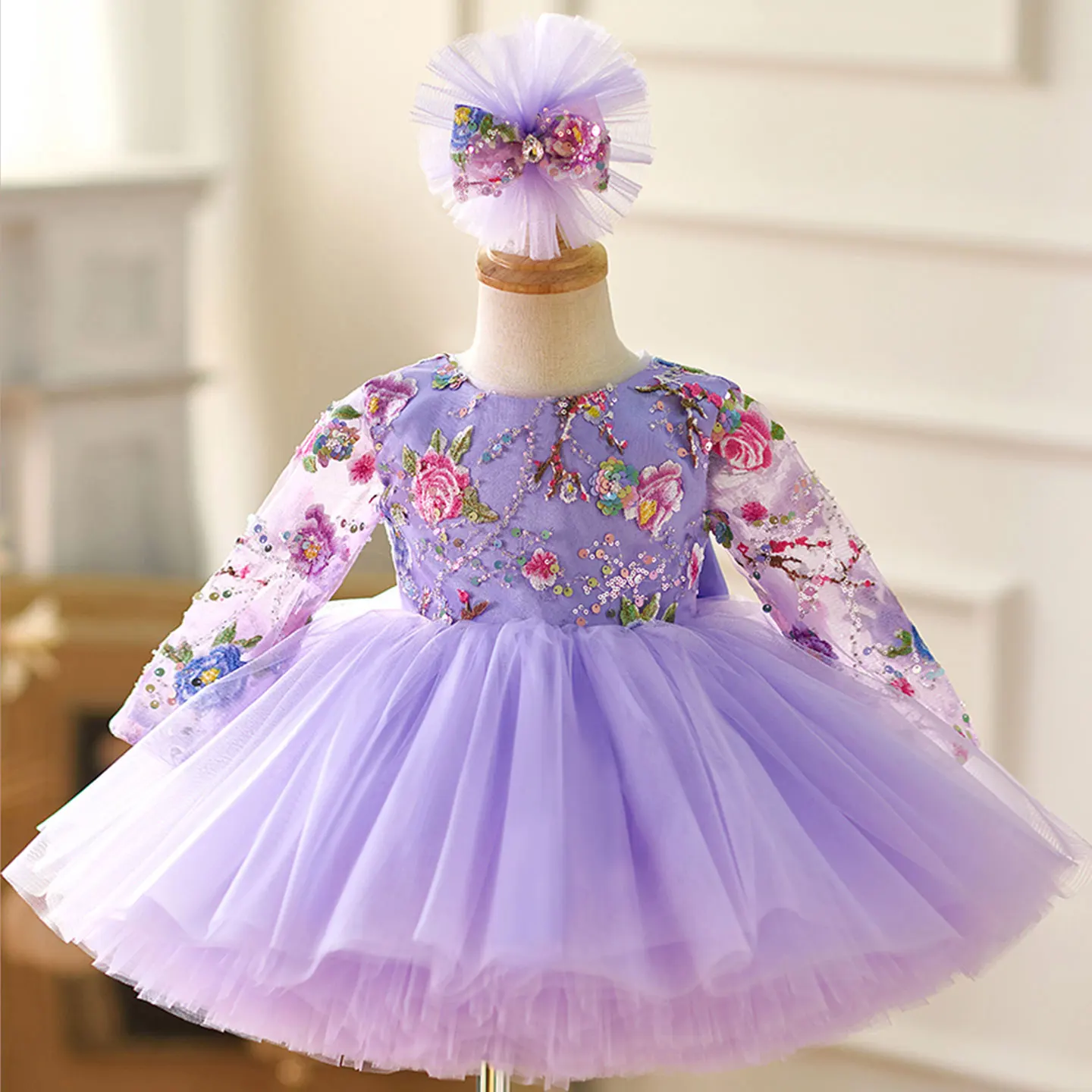 Jill Wish Lilac Baby Lace Long Sleeve Adorable Girl Dress with Bow Knee Length Princess Wedding Birthday Party Ball Gown J055