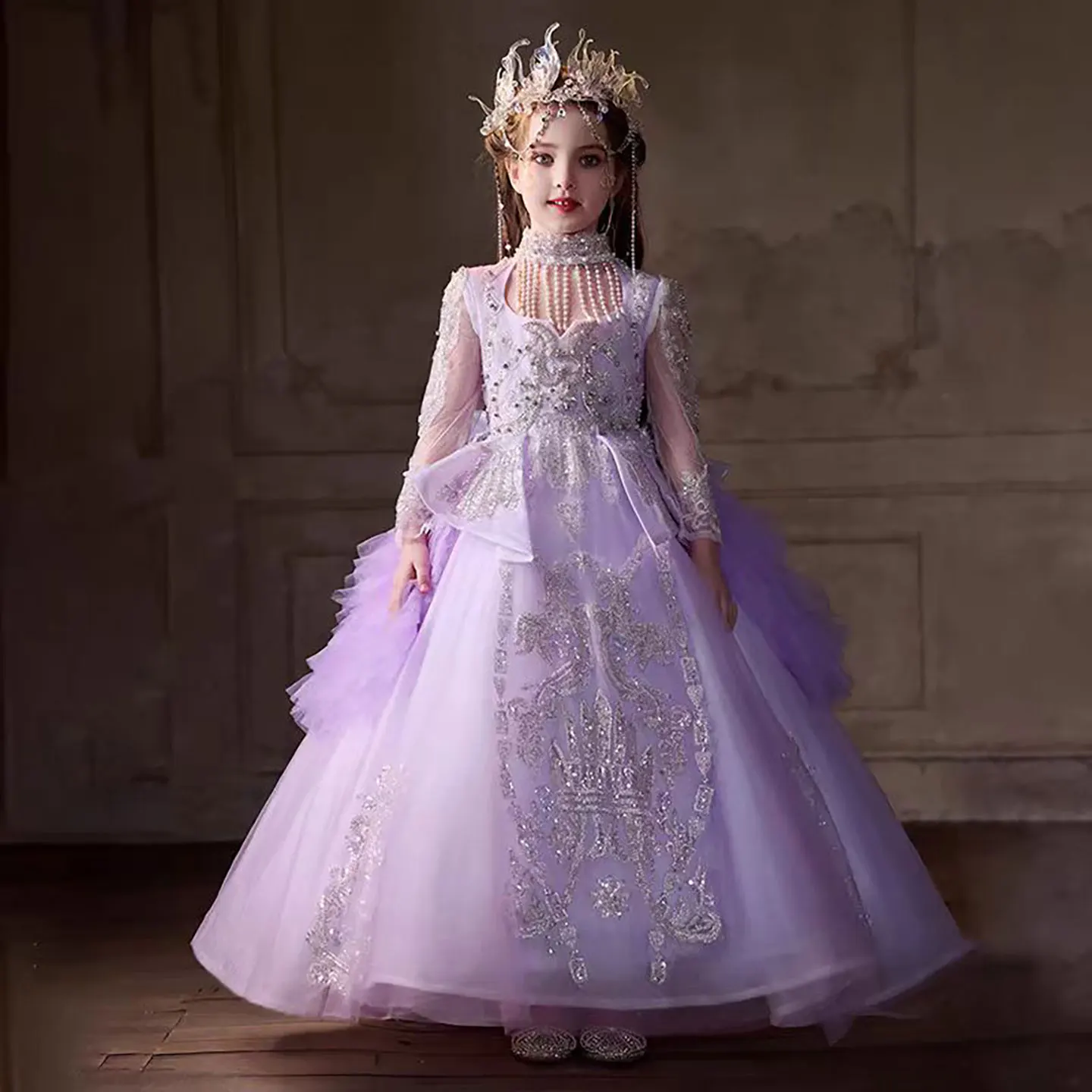 Jill Wish luxury Flower Girl Dress Crystal Beads Long Sleeve Princess Kids Wedding Birthday Party Long Pageant Ball Gown J271