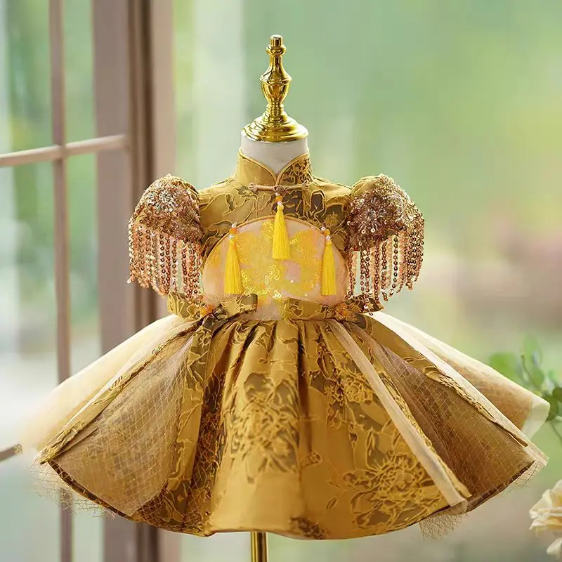Jill Wish Luxury Gold Flower Girl Dress Knee Length Puffy Sleeve Children Princess Wedding Toddler Birthday Party Gowns J490