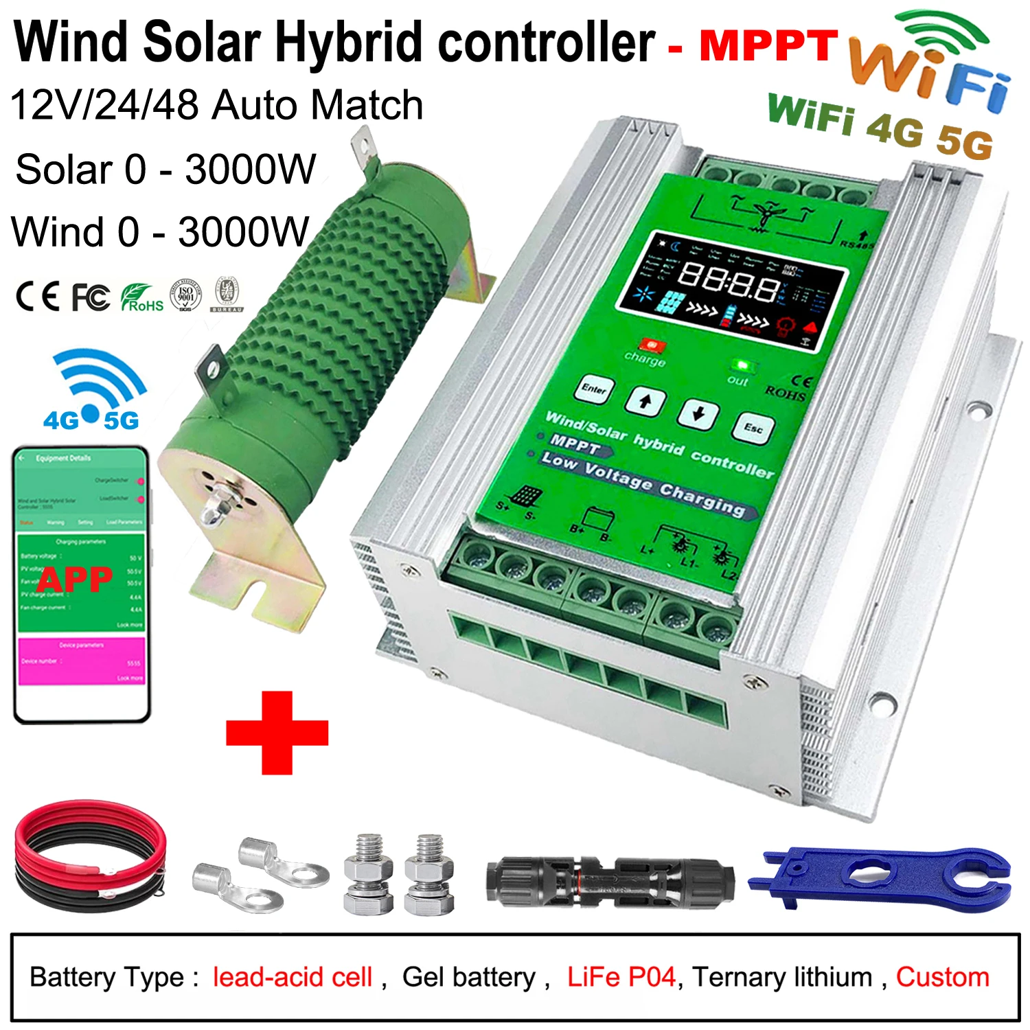 JNGE 12V 24V 48V 3000W Wind Solar Hybrid Charge Controller MPPT Charge for Solar Panel Wind Turbine Lithium Lead Acid Battery