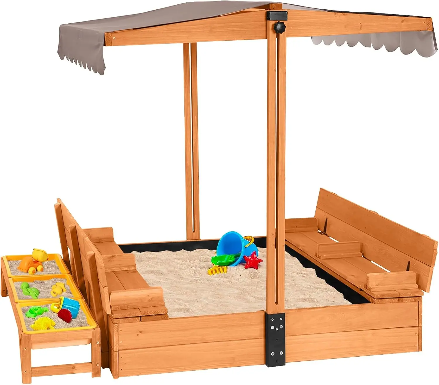 Kids Wooden Sandbox for Backyard, Large Sand Box with 2 Bench Seats and Toy Bin Storage- Bottomless Sand Pit