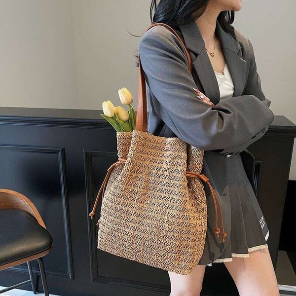 Lazy Style Straw Shoulder Bag for Women 2024 New Summer Beach Vacation Large Capacity Drawstring Handbag