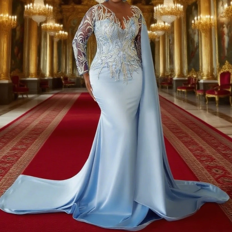 Description: Introducing our Light Sky Blue MermaiD Mother of Bridesmaid Dresses, the latest collection by Lace Beaded Evening Party Dress VinTagge! This stunning dress is crafted from light-blue chiffon, featuring a flattering A-line silhouette that flows effortlessly down your body. The intricate floral and geometric embellishments adorning the bodice are a perfect match for the beaded lace on the skirt, while the lace overlay adds extra elegance to this stunning ensemble. Dress up with a pair of statement pearl drop earrings or a bold clutch for a chic and sophisticated look. This dress is a perfect match for any mother’s wedding day attire, as well as cocktail parties, charity galas, or red carpet events. This dress comes in our Laced Beaded Evening Party Dresses VinTagge Collection and features a 125cm-length skirt with a modest neckline, which falls to the floor in a sweetheart bateau neckline. The mermaid-style cut exposes your natural waistline while the fitted bodice hugs your curves in all the right places. The dress is fully lined and finished with a flattering, adjustable back zipper closure, ensuring that you are comfortable throughout your event. The dress comes with a matching white veil in an elegant and coordinating shade of navy blue. Don’t miss out on this perfect match for any occasion! Order now before we run out! Shop our Light Sky Blue MermaiD Mother of Bridesmaid Dresses, Laced Beaded Evening Party Dress VinTagge Collection today at 10% off, and avail of the latest discount code: MOTHEROFBRIDESMAIDS_35. We guarantee that our light-blue chiffon dress will elevate your look in a big way! Shop now for the perfect gown to impress even on your grandest occasion.