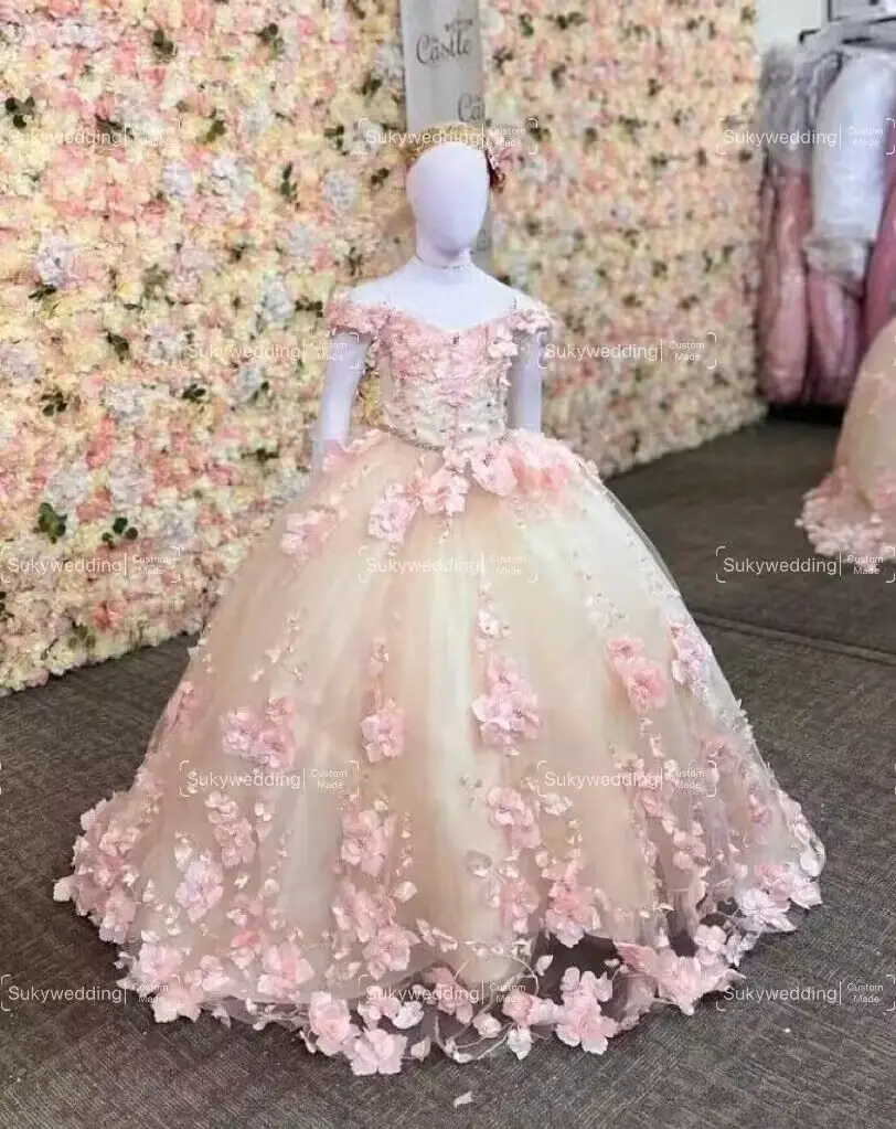 Little Princess Wedding Party Gowns Off Shoulder Mini Quinceanera Dress for Girls 3D Floral Applique Flower Girls Dresses
