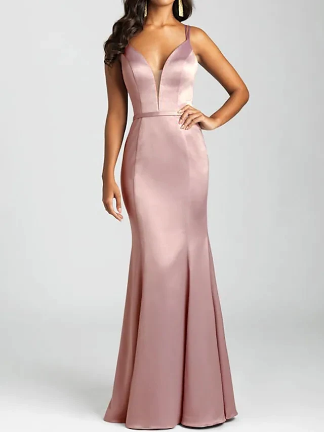 Long Mermaid Pink Evening Dress V Neck Spaghetti Sleeveless Elegant Floor Length Satin Prom Dress with Pleats for Women
