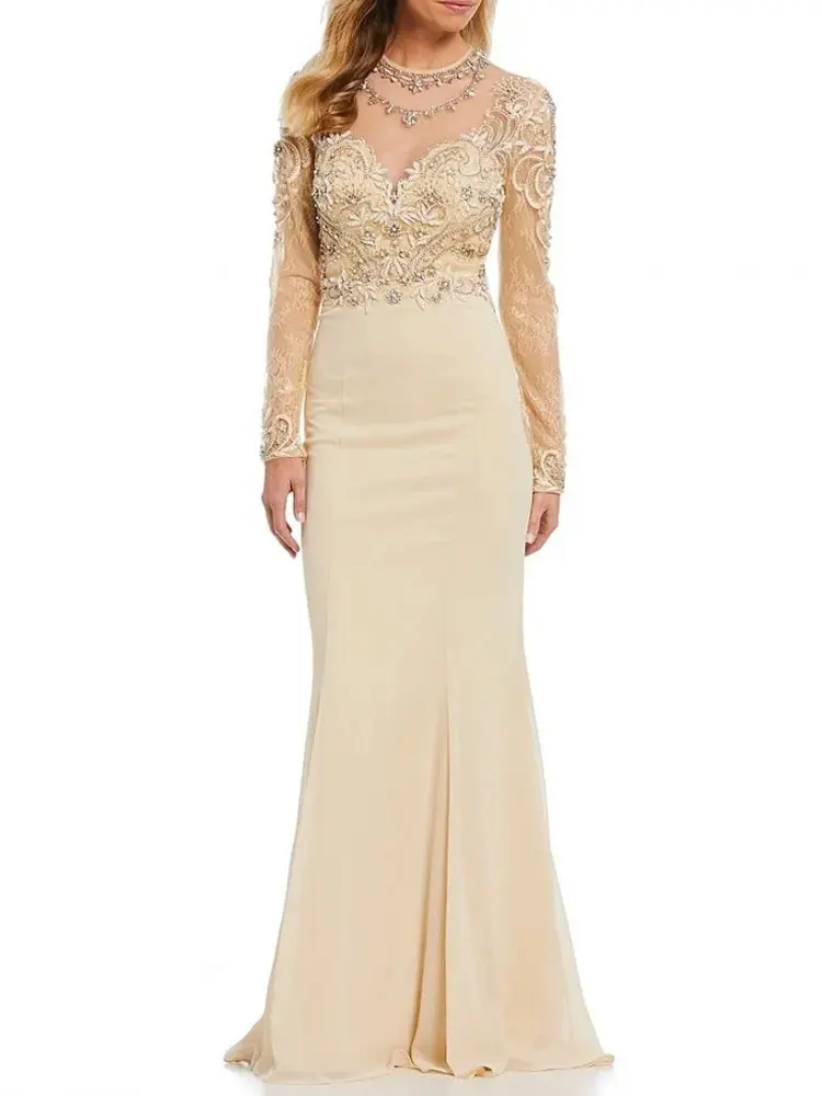 Long Sleeve Champagne Mother Of The Bride Dresses Jewel Neck Lace Beaded Wedding Guest Dress Plus Size Formal Evening Gowns