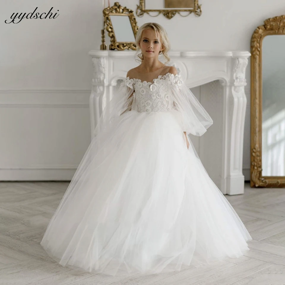 Lovely White Lace Appliques Puffy Sleeves Flower Girl Dresses For Wedding 2025 Princess Tulle Ball Gown First Communion Gowns