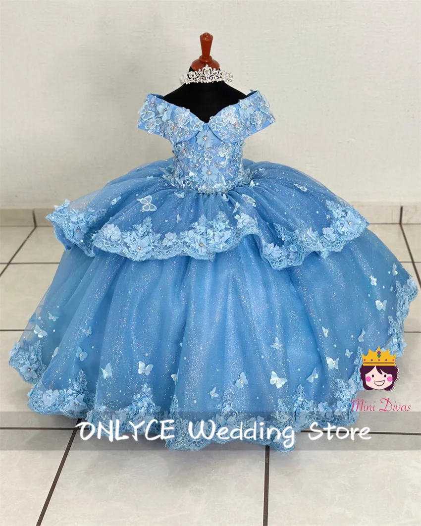 Luxury Blue Flower Girls Dress For Weddings Floral Butterfly Applique Crystal Pearls Birthday Gown First Communion Customized