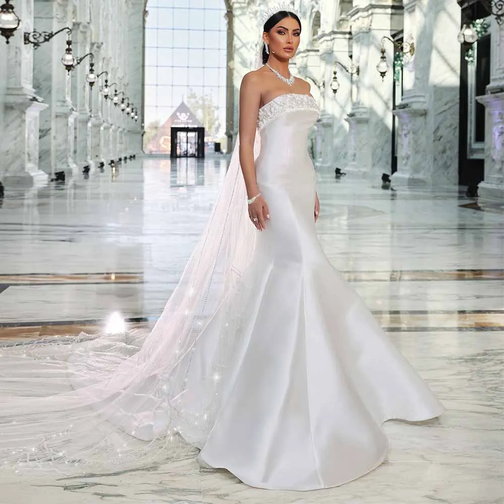 Luxury Dresses Women 2025 Wedding Satin Mermaid/Trumpet Wedding Party Dress White Strapless Ruched Beads Hall Wedding Dress Long